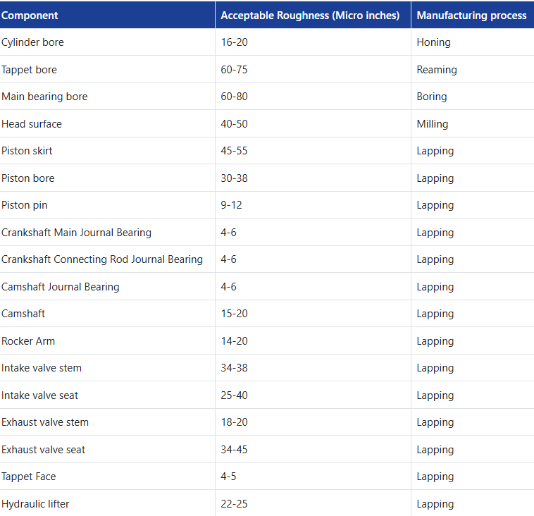 Sau đây là 1 số bộ phận và tiêu chuẩn dành cho 1 số bộ phận trong động cơ xe ô tô. Các yêu cầu có thể thay đổi đối với 1 số nhà máy, đơn vị sản xuất khác nhau.